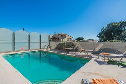 Aucanada 1 km from Puerto de Alcúdia: Beautiful, cosy, comfortable terraced house "La Isla, 5", semi-detached. In the centre of Aucanada, in a sunny, elevated position residential area (villas), 400 m from the sea, 400 m from the beach. Private: beautiful garden to relax, courtyard, swimming pool angular (01.01.-31.12.). Pergola, terrace, garden furniture, barbecue. In the house: internet access, WiFi, air conditioning, washing machine. Roofed, parking. Grocery, supermarket, restaurant, bar, café, pub garden 400 m, shingle beach "Aucanada" 400 m. Golf course (18 hole) 1 km. Please note: suitable for families, suitable for seniors baby equipment (included). Object suitable for 8 adults groups of teenagers on request only. Loading and unloading of baggage is possible at the holiday house. Airfield 55 km from the property.Availability