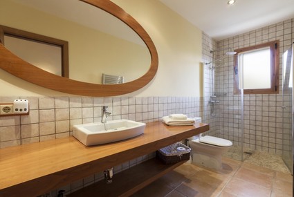 The living-dining room is a light and airy space with dining table and chairs for 6 people, comfortable sofas, flat screen TV and a working chimney. The whole area is air conditioned and the villa has WIFI. There are three bedrooms in total. All have air conditioning and large fitted wardrobes. There are two twin bedrooms with en-suite shower rooms and a master bedroom with full en-suite bathroom. There is also a separate small bathroom.