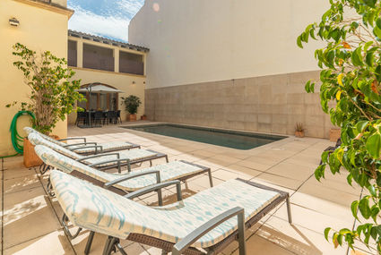 Sa Pobla: Very large, beautiful, comfortable house "Can Campins", 2 storeys. In the centre of Sa Pobla, excellent location: right in the centre but still quiet, in the heart of the city, 10 km from the beach. Private: swimming pool angular (7 x 4 m, depth 120 - 180 cm, seasonal availability: 01.Jan. - 31.Dec.). WC in the pool area, outdoor shower, arbour, pergola, terrace, garden furniture. In the house: internet access, WiFi, storage room for bicycles, central heating system, washing machine, drying room. Shop, grocery 150 m, supermarket 300 m, restaurant, bar 150 m, bakery 170 m, pedestrian zone 1 m, pub garden 150 m, 1 minute walk to the centre, railway station 1 km, sandy beach 10 km. Sports harbour 15 km, marina 15 km, golf course (18 hole) 20 km. Please note: suitable for families, suitable for seniors. Object suitable for 8 adults groups of teenagers on request only. Part of the house is closed and unoccupied. Railway line closeby 850 m from the property. Airfield 51 km from the property.Availability