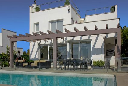 Modern villa "Villa Brisas", built in 2010. House Equipment: air conditioning, burglar alarm system, washing machine (private use). Access & Parking: parking by the house. All-season motor access to the house. Stepped path. Situation: in the centre of 1900 mts, quiet, sunny position on top of a hill, on the beach. View from the apartment of the sea and the countryside. Surroundings of the house: grounds (private use, 634 m2, fenced), swimming pool (private use), indoor pool (private use), outside shower (private use), tennis (shared use), barbecue (private use). Facilities and distances: shop 1.7 km, grocers 1.5 km, supermarket 1.8 km, restaurant 1.5 km, sandy beach 1.9 km, golf course 20 km, tennis 1.8 km, riding stables 500 m, children's playground 1.5 km, m bus stop 1.5 km. Please note, nearby is a main road in 800 m and ein airport/airfield in 20 km.Availability